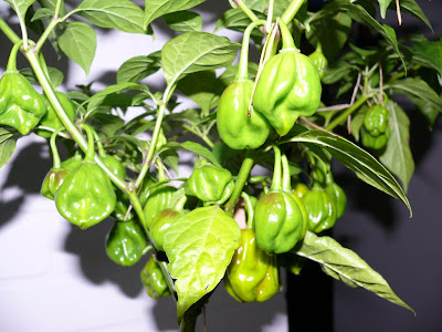 Eine Habanero-Pflanze habe ich nun ins Haus geholt - und zwar zu mir nach oben ins Warme. Mal sehen, ob die Früchte hier schnell abreifen... ist ein Versuch.